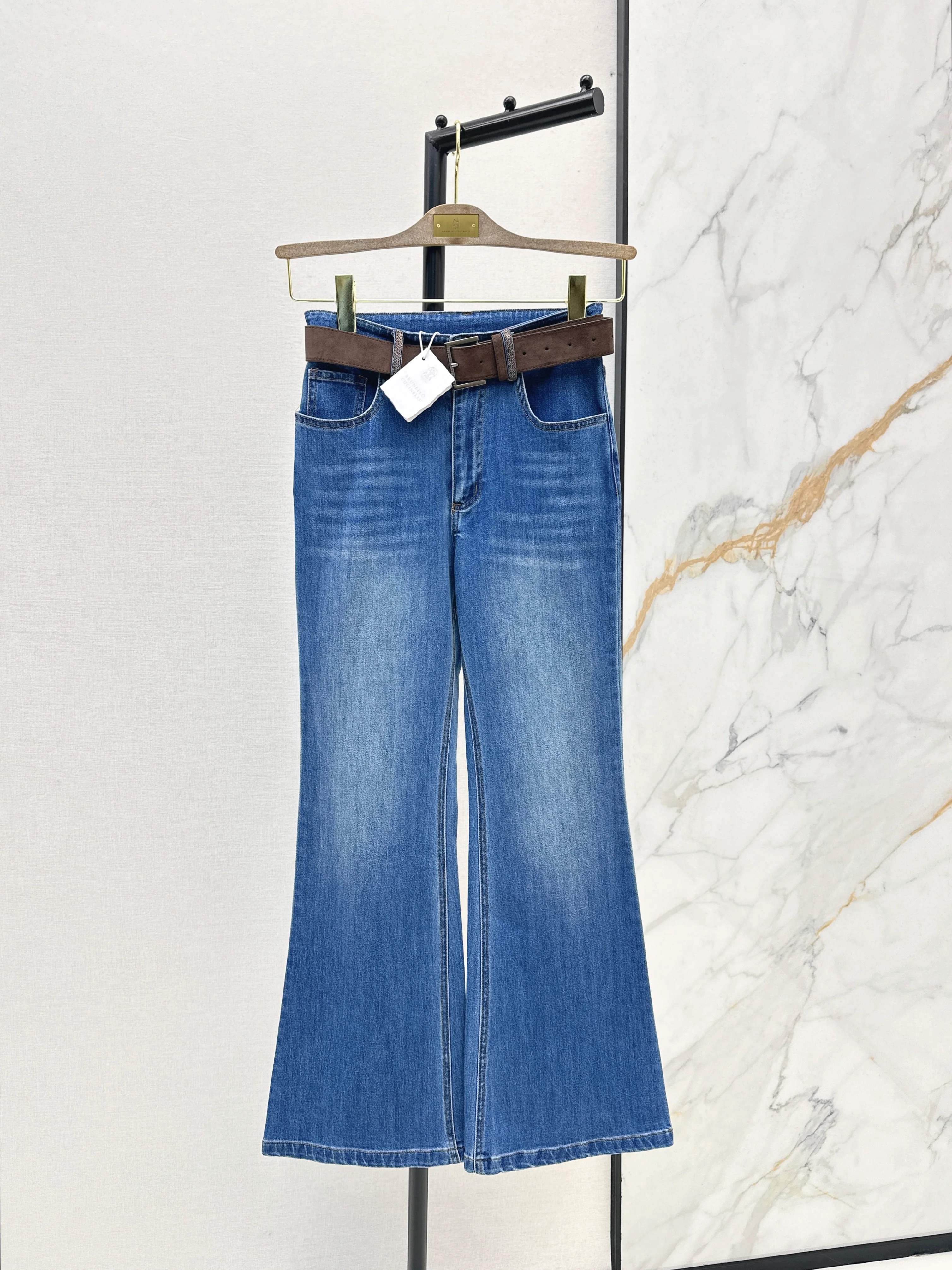 Belt-trimmed flared jeans